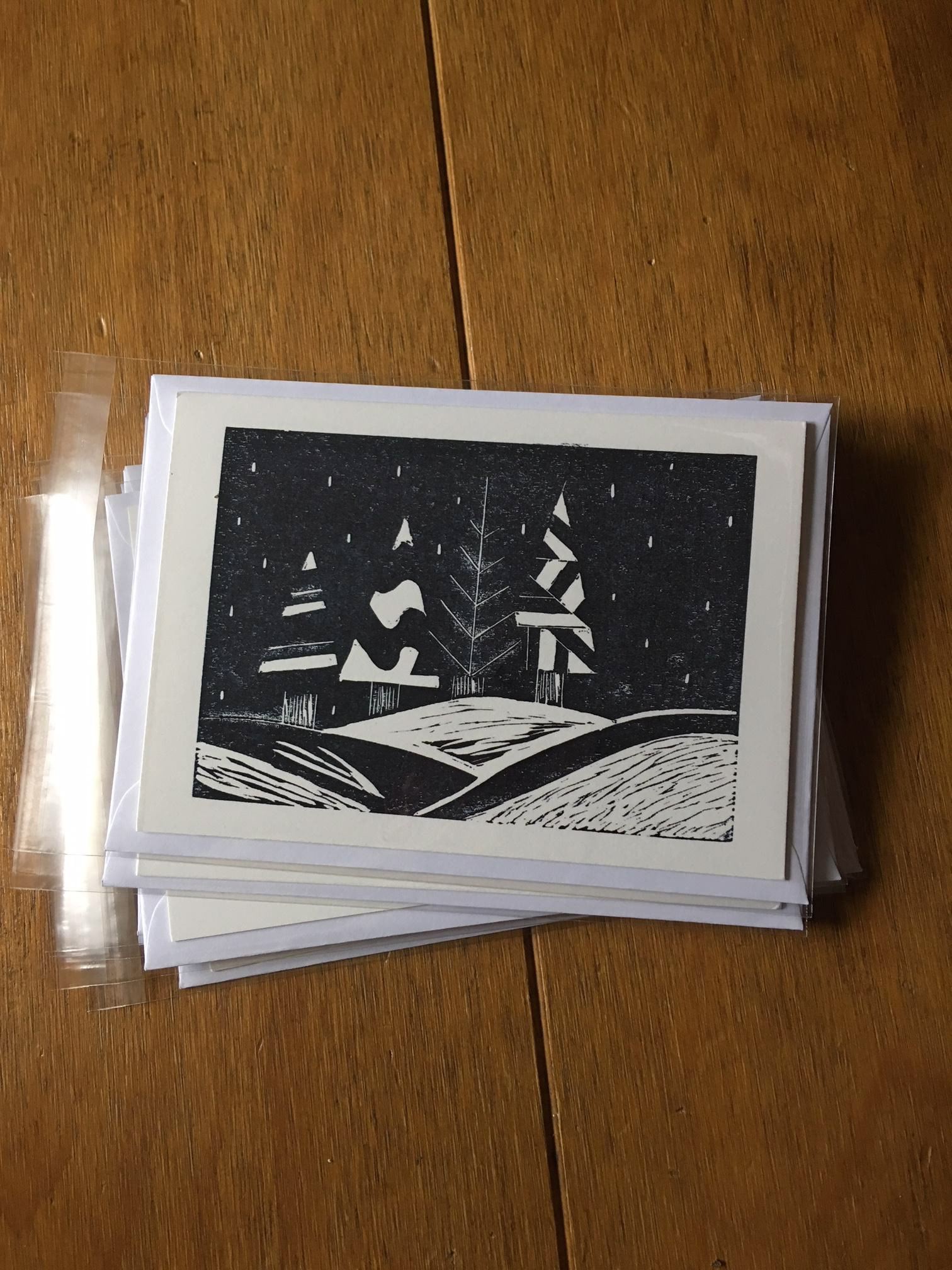 My first lino cut, a festive scene of geometric trees in a snow storm.